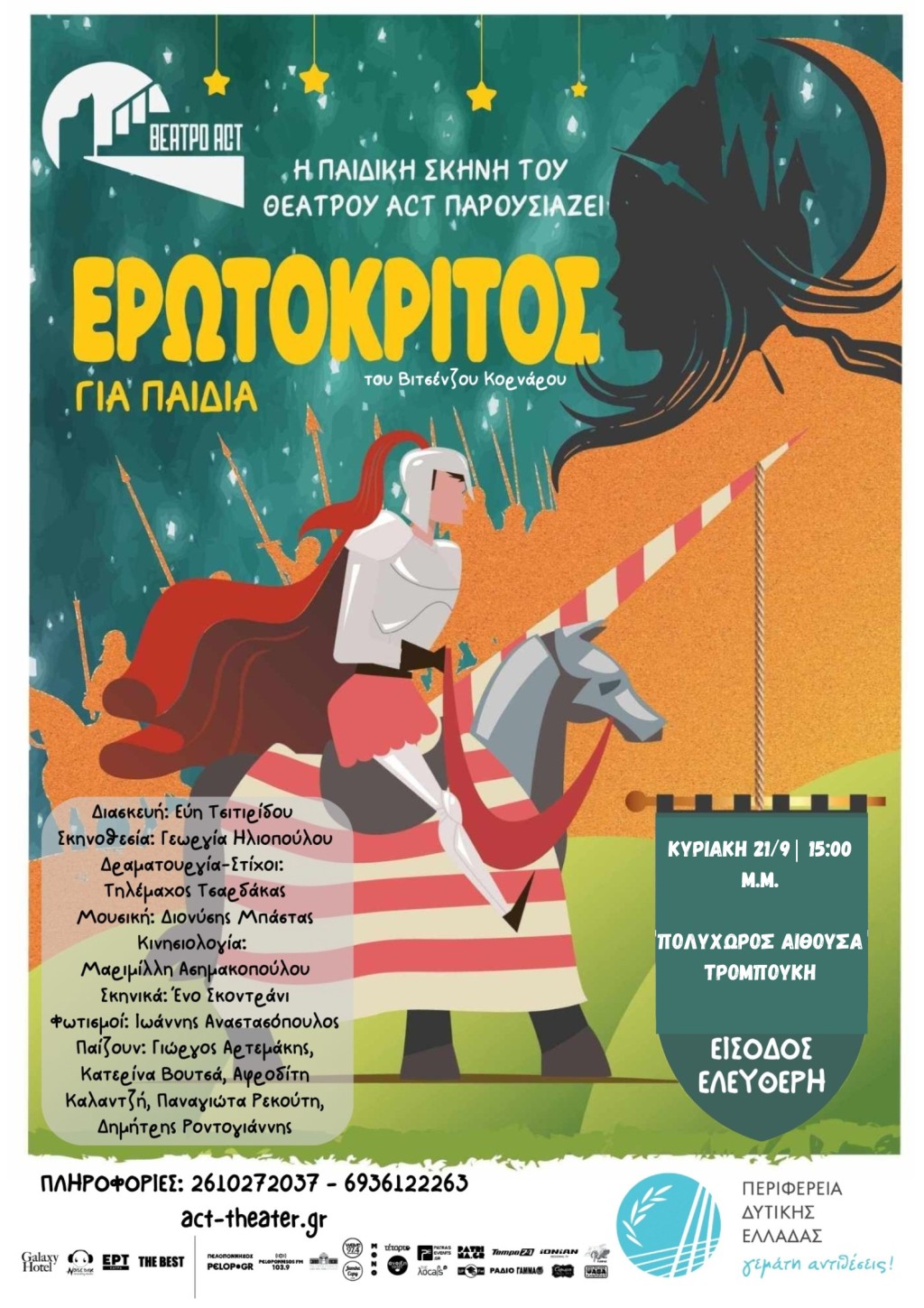 Ο Δήμος Αμφιλοχίας φιλοξενεί την Κυριακή 21/9 στις 15:00 στην Αμφιλοχία την παράσταση του κλασσικού έργου «ΕΡΩΤΟΚΡΙΤΟΣ» που παρουσιάζουν η Περιφέρεια Δυτικής Ελλάδας σε συνεργασία με την επαγγελματική θεατρική ομάδα Κάνθαρος του θεάτρου act.