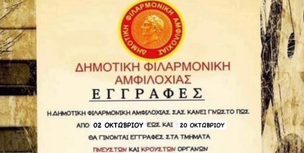 Ξεκινούν οι εγγραφές στη Δημοτική Φιλαρμονική Αμφιλοχίας από 2 Οκτωβρίου έως και 20 Οκτωβρίου στα τμήματα θεωρίας και εκμάθησης πνευστών και κρουστών μουσικών οργάνων.