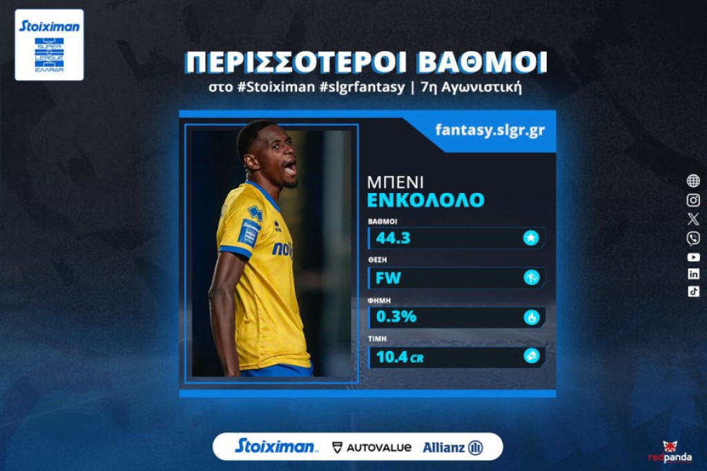 O Μπένι Ενκολόλο με 44,3 βαθμούς αναδείχθηκε Slgr Fantasy Player of the Week για την 7η αγωνιστική στο επίσημο παιχνίδι fantasy του πρωταθλήματος.