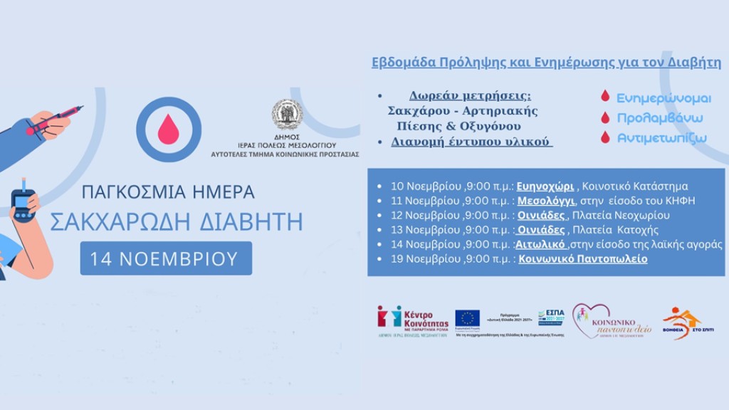 Το Αυτοτελές Τμήμα Κοινωνικής Προστασίας του Δήμου Ιερής Πόλης Μεσολογγίου, σε συνεργασία με το Κέντρο Κοινότητας, το Κοινωνικό Παντοπωλείο και το πρόγραμμα «Βοήθεια στο Σπίτι», διοργανώνει εβδομάδα πρόληψης και ενημέρωσης για τον Σακχαρώδη Διαβήτη, με αφορμή την Παγκόσμια Ημέρα Διαβήτη, που τιμάται στις 14 Νοεμβρίου κάθε χρόνο.