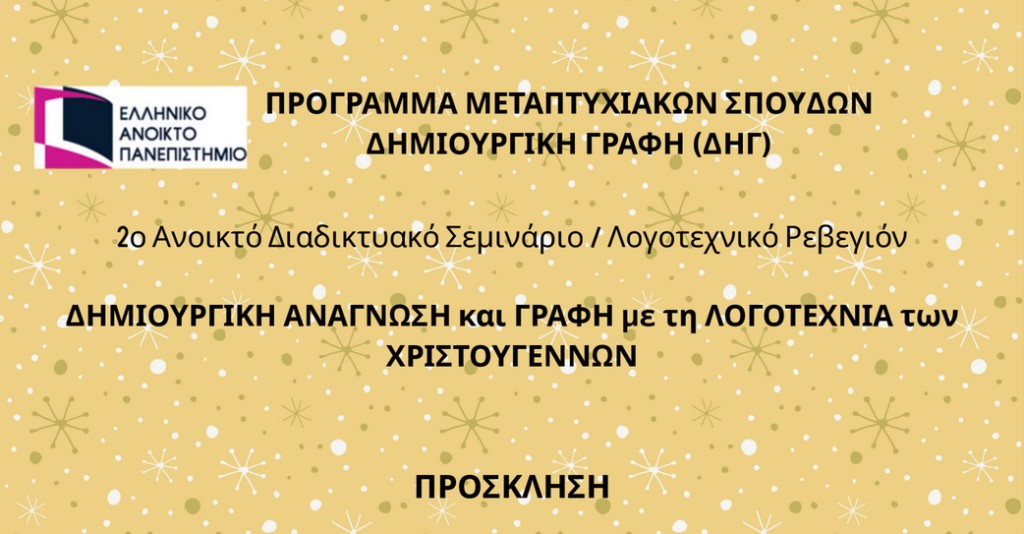 Αυτά και άλλα παρόμοια θα μας απασχολήσουν στο 2ο Ανοικτό Διαδικτυακό Σεμινάριο / Λογοτεχνικό Ρεβεγιόν του Προγράμματος Μεταπτυχιακών Σπουδών «Δημιουργική Γραφή» (ΔΗΓ) του Ελληνικού Ανοικτού Πανεπιστημίου (ΕΑΠ), που οργανώνεται στο πλαίσιο της Θεματικής Ενότητας ΔΗΓ55 «Δημιουργική Γραφή στην Εκπαίδευση», τη Δευτέρα, 5 Ιανουαρίου, ώρες 16:00΄-18:00΄, με θέμα: