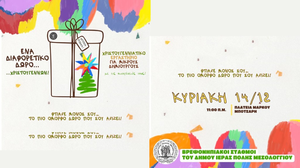 Οι Βρεφονηπιακοί Σταθμοί του Δήμου Ιεράς Πόλης Μεσολογγίου προσκαλούν όλα τα παιδιά και τις οικογένειές τους σε ένα χαρούμενο, δημιουργικό και... πολύχρωμο Χριστουγεννιάτικο Εργαστήριο!
