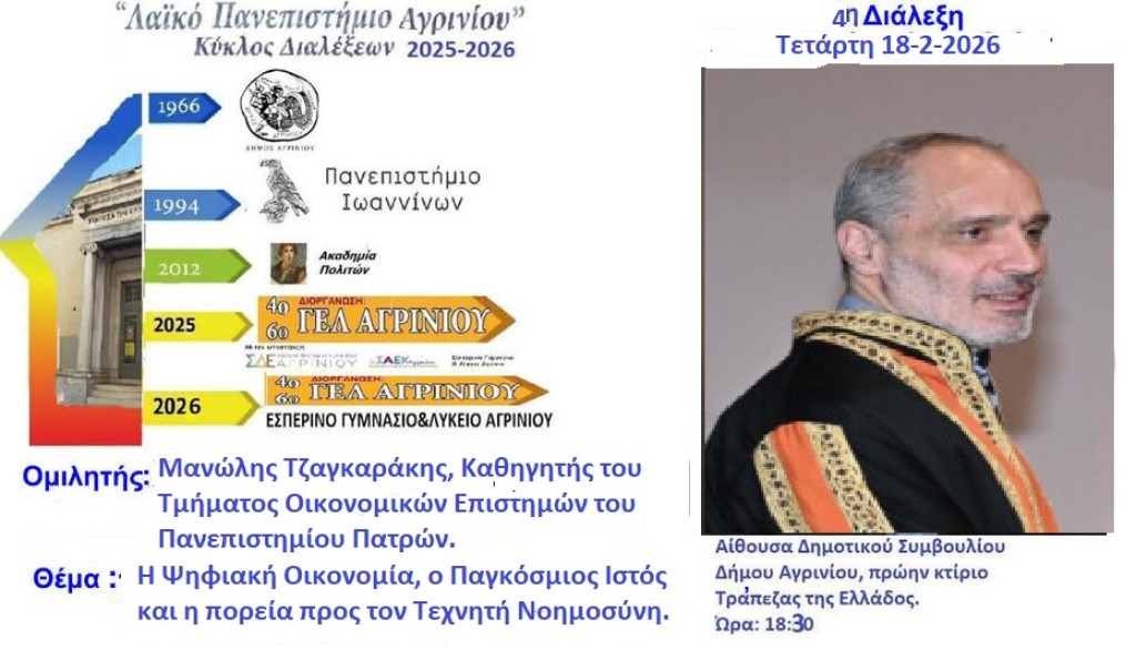 Το Λαϊκό Πανεπιστήμιο Αγρινίου διοργανώνει την Τέταρτη Διάλεξη του στο κτίριο της Πρώην Τραπέζης της Ελλάδος την Τετάρτη 18-2-2026 και ώρα 18:30. Ομιλητής θα είναι ο Μανώλης Τζαγκαράκης, Καθηγητής του Τμήματος Οικονομικών Επιστημών του Πανεπιστημίου Πατρών.