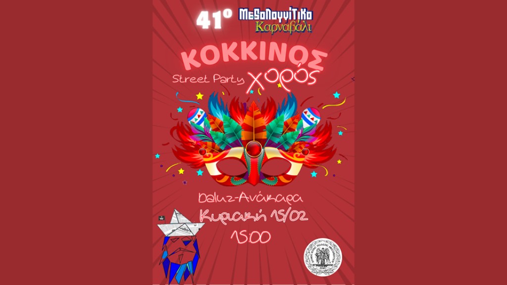 Με αποκριάτικες στολές, μουσική, χορό και έντονα χρώματα, ο «Κόκκινος Χορός» υπόσχεται ένα μοναδικό street party που θα ξεσηκώσει το κοινό και θα δώσει παλμό στις φετινές αποκριάτικες εκδηλώσεις. Η συμμετοχή είναι ανοιχτή για όλους, με στόχο τη δημιουργία μιας ζωντανής, χαρούμενης και συμμετοχικής εμπειρίας για ολόκληρη την τοπική κοινωνία.