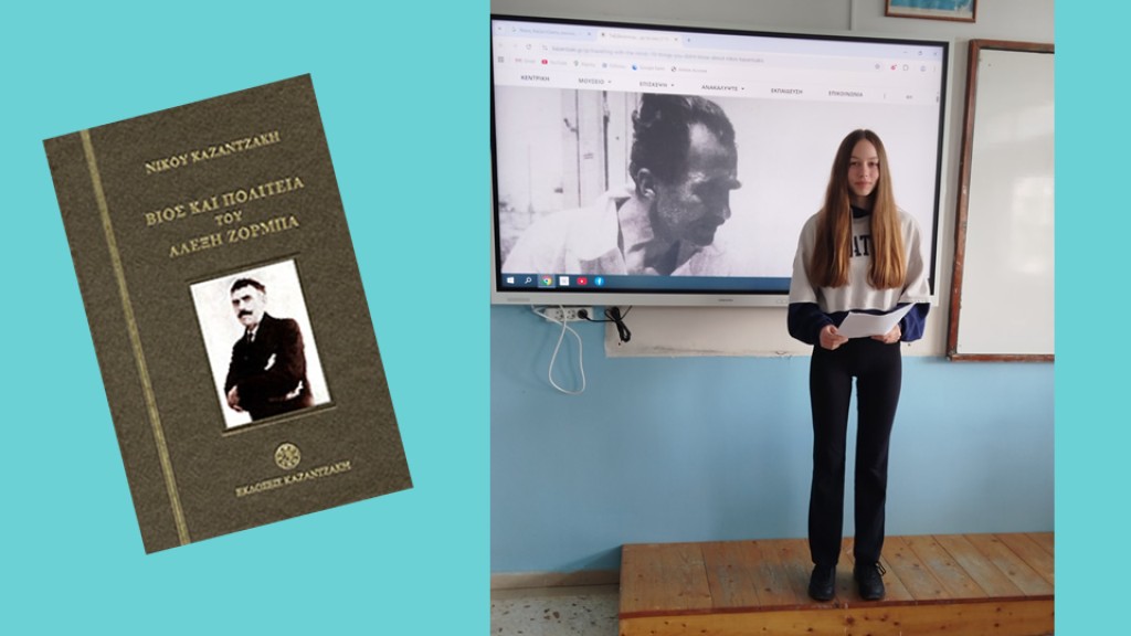 Φωτο άρθρου: Η μαθήτρια Γ Γυμνασίου, Ευτυχία Καραθάνου, παρουσιάζει τον Ζορμπά στους συμμαθητές της… Πόσο χαρούμενος θα ήταν ο Οικουμενικός Συγγραφέας Ν. Καζαντζάκης, αν έβλεπε την απήχηση του έργου του, 80 χρόνια μετά…