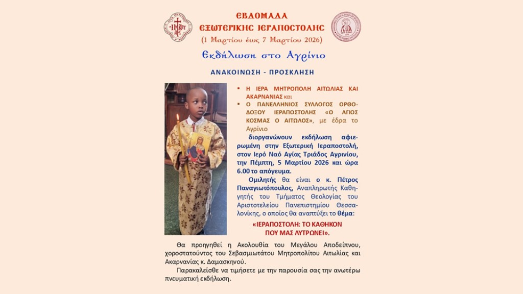Η Ιερά Μητρόπολη Αιτωλίας και Ακαρνανίας και ο Πανελλήνιος Σύλλογος Ορθοδόξου Ιεραποστολής «Ο Άγιος Κοσμάς ο Αιτωλός», με έδρα το Αγρίνιο διοργανώνουν εκδήλωση αφιερωμένη στην Εξωτερική Ιεραποστολή, στο Αγρίνιο, στον Ιερό Ναό Αγίας Τριάδος, την Πέμπτη 5 Μαρτίου 2026 και ώρα 18:00’ το απόγευμα.
