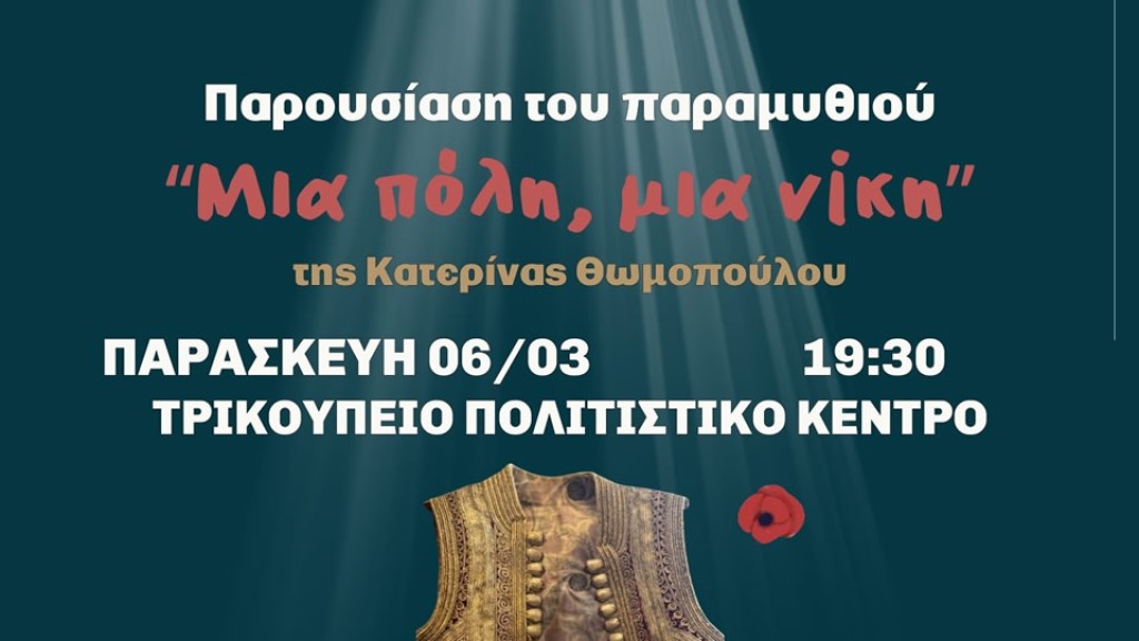 Ο Δήμος Ιεράς Πόλεως Μεσολογγίου ανακοινώνει ότι την Παρασκευή 6 Μαρτίου 2026, ώρα 19:30, στο Τρικούπειο Πολιτιστικό Κέντρο θα πραγματοποιηθεί η παρουσίαση του παιδικού βιβλίου «Μια πόλη, μια νίκη» της Κατερίνας Θωμοπούλου.