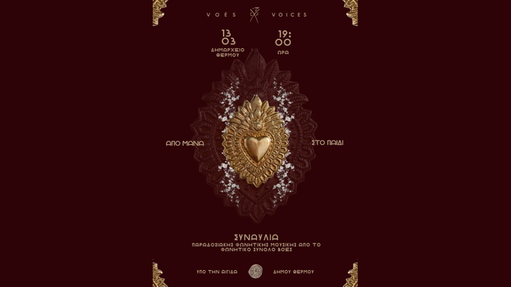 Συναυλία παραδοσιακής φωνητικής μουσικής απο το φωνητικό σύνολο ΒΟΕΣ που θα πραγματοποιηθεί στην αίθουσα εκδηλωσεων του Δημαρχιακού Μεγάρου Θέρμου την Παρασκευή 13 Μαρτίου 2026 και ώρα 19:00.