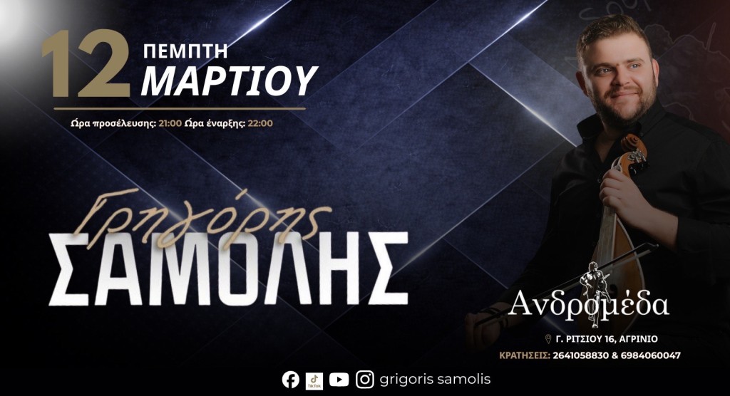 Το Αγρίνιο ετοιμάζεται να υποδεχθεί τον Κρητικό λυράρη Γρηγόρη Σαμόλη, ο οποίος θα εμφανιστεί ζωντανά στη Μουσική Σκηνή Ανδρομέδα την Πέμπτη 12 Μαρτίου 2026.