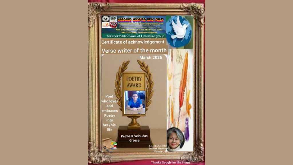 Σήμερα 11 Μαρτίου Τετάρτη ώρα Ελλάδας 11η πρωινή η διεθνής διαδικτυακή ποιητική ομάδα των Φιλιππίνων zezabek quote and poems απένειμε διεθνές ποιητικό βραβείο ως τον καλύτερο ποιητή του μηνός Μαρτίου στον Αιτωλοακαρνάνα-Αγρινιώτη ποιητή Πέτρο Κυριάκου Βελούδα.