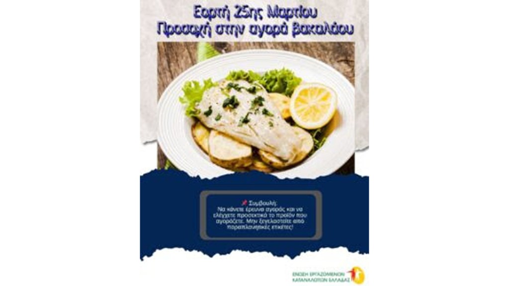 Η ΕΕΚΕ ενημερώνει το καταναλωτικό κοινό για τον κίνδυνο σύγχυσης και παραπλάνησης στην αγορά του μπακαλιάρου για το γιορτινό τραπέζι της 25ης Μαρτίου και επισημαίνει τα εξής: