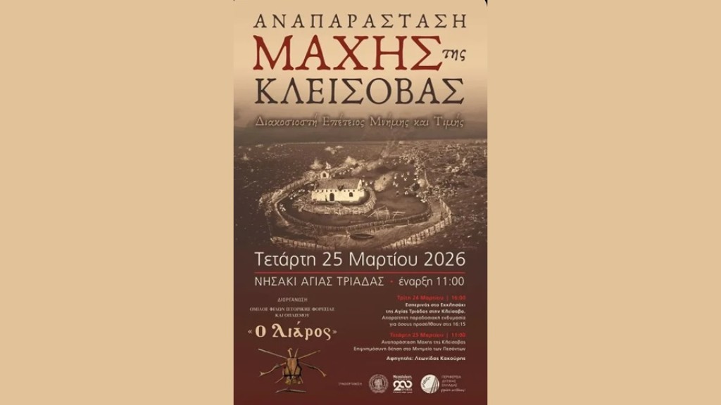 Ο Δήμος Ιεράς Πόλεως Μεσολογγίου, η Περιφέρεια Δυτικής Ελλάδας και ο Όμιλος Φίλων Ιστορικής Φορεσιάς και Οπλισμού «Ο Λιάρος» διοργανώνουν την Αναπαράσταση της Μάχης της Κλείσοβας, η οποία θα πραγματοποιηθεί στις 11:00 την Τετάρτη 25 Μαρτίου 2026 στο Νησάκι της Αγίας Τριάδας.