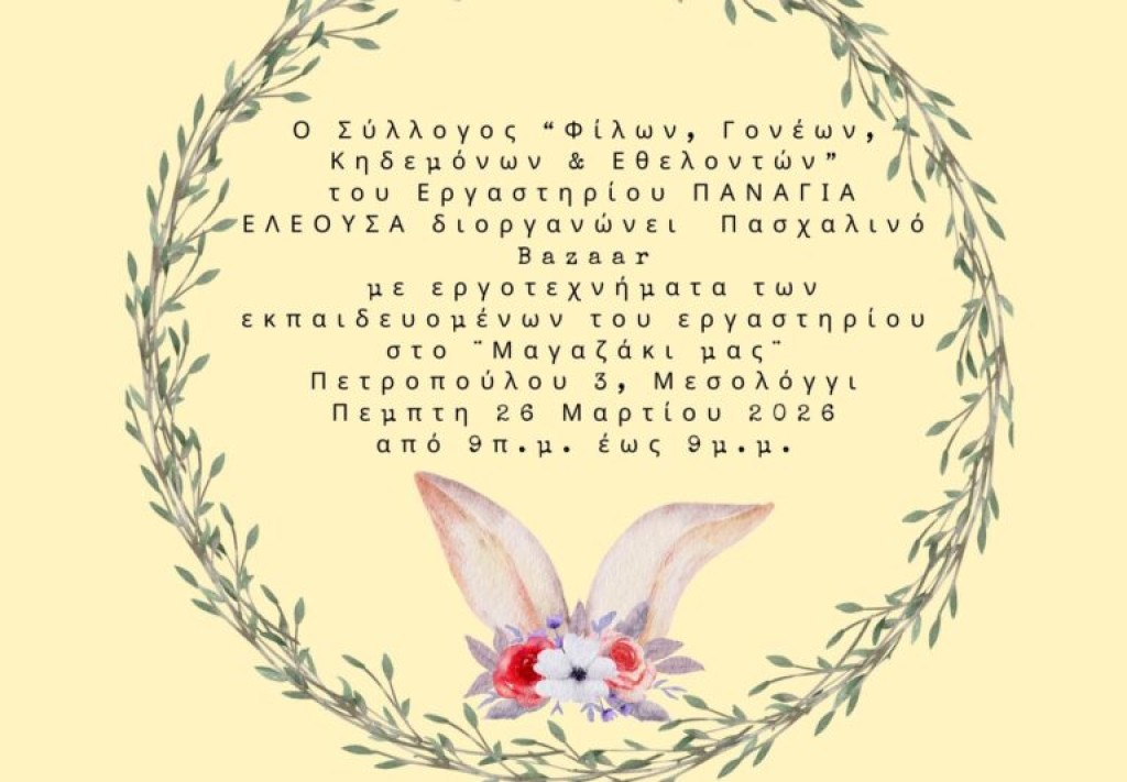 O Σύλλογος «Φίλων Γονέων Κηδεμόνων και Εθελοντών» του Εργαστηρίου Νέων «Παναγία Ελεούσα» διοργανώνει Πασχαλινό Bazaar, με εργοτεχνήματα των εκπαιδευομένων του Εργαστηρίου στο «Μαγαζάκι μας», Πετροπούλου 3 Μεσολόγγι.