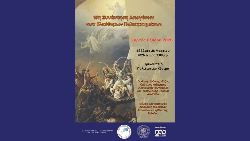 Ο Δήμος Ιεράς Πόλεως Μεσολογγίου και η Διεθνής Αδελφότητα Απογόνων Ελευθέρων Πολιορκημένων διοργανώνουν στο πλαίσιο των επετειακών εκδηλώσεων για τη Διακοσιοστή Επέτειο από την Έξοδο του Μεσολογγίου, την 16η Συνάντηση Απογόνων των Ελευθέρων Πολιορκημένων το Σάββατο 28 Μαρτίου 2026 και ώρα 19:00, στο Τρικούπειο Πολιτιστικό Κέντρο.