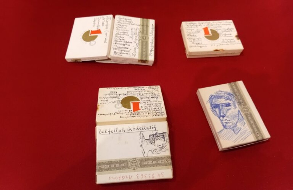 Ίσως η πιο συγκινητική προθήκη είναι αυτή που φιλοξενεί κειμήλια του Γιάννη Ρίτσου από το Μουσείο Μπενάκη και το Ιστορικό Αρχείο του. Πρόκειται για τα θρυλικά πακέτα ΑΣΣΟΣ Παπαστράτου με ιδιόχειρες σημειώσεις του μεγάλου μας ποιητή. Ένα μάλιστα από αυτά απεικονίζει σκίτσο που φιλοτέχνησε ο Ρίτσος.