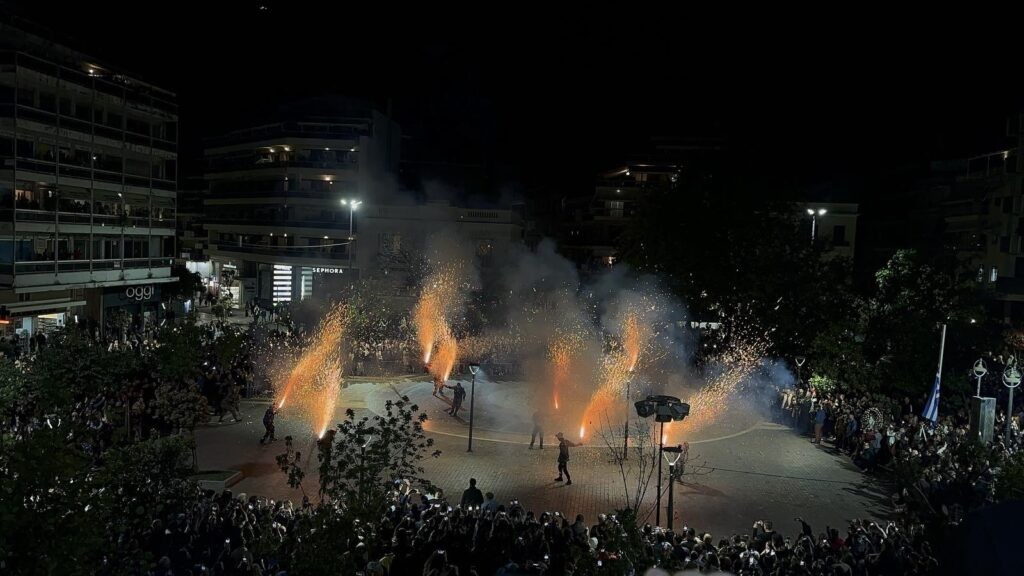 Η στιγμή που οι πύρινες δέσμες σκίζουν το σκοτάδι αποτελεί την κορύφωση της βραδιάς, μετατρέποντας το κέντρο σε ένα σκηνικό φαντασμαγορικό.