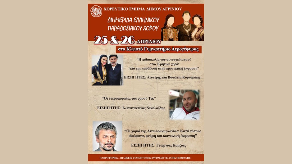 Με μεγάλη χαρά σας προσκαλούμε στη Διημερίδα Ελληνικού Παραδοσιακού Χορού που διοργανώνει το Χορευτικό Τμήμα Δήμου Αγρινίου, στις 25 & 26 Απριλίου, στο Κλειστό Γυμναστήριο Αερογέφυρας.