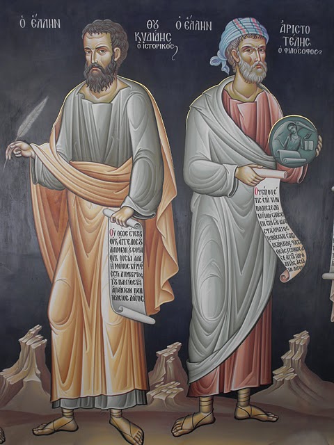 Οι τοιχογραφίες βρίσκονται στον προαύλιο χώρο της Ιεράς Μονής Μεγάλου Μετεώρου. Εικονίζονται ο Σόλωνας, η Σίβυλλα, ο Σωκράτης, ο Πυθαγόρας, ο Όμηρος, ο Θουκυδίδης, ο Αριστοτέλης, ο Πλάτωνας, ο Πλούταρχος και δίπλα τους ο Άγιος Ιουστίνος ο φιλόσοφος και μάρτυρας του 2ου αιώνα μ.Χ. Αντίστοιχες τοιχογραφίες υπάρχουν σε πολλές Μονές του Αγίου Όρους (π.χ Βατοπαίδι, Μεγίστη Λαύρα) καθώς και σε Μονές στο νησάκι των Ιωαννίνων.