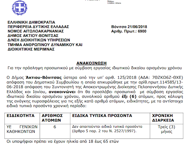 Οι ενδιαφερόμενοι μπορούν να υποβάλουν αίτηση στα γραφεία στο Δημαρχείο Ακτίου – Βόνιτσας, εντός προθεσμίας πέντε ημερών, δηλαδή έως και την Τρίτη 26 Ιουνίου 2018.