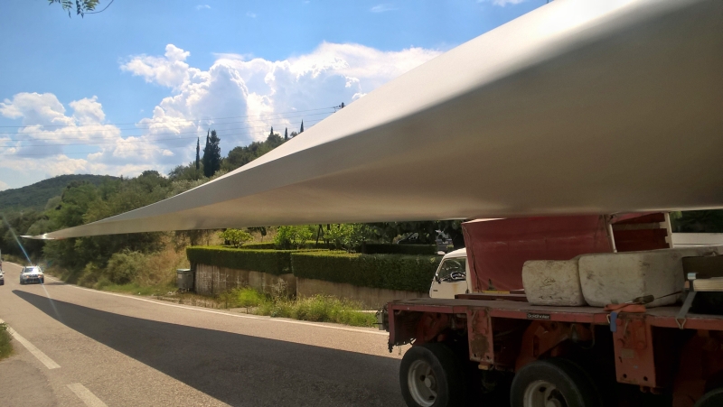 Ενα πρωτόγνωρο και εντυπωσιακό θέαμα εντικρύσαμε το πρωϊ της Παρασκευής 3 Αυγούστου 2018 ταξιδεύοντας στον επαρχιακό δρόμο Αγρινίου - Εμπεσσού στον Βάλτο. Συγκεκριμένα συναντήσαμε δυο ειδικά φορτηγά τα οποία μετέφεραν απο ενα πτερύγιο έκαστο για τις ανεμογεννήτριες που θα τοποθετηθούν σε κάποιο βουνό της περιοχής. Το μεγάλο μέγεθος το οποίο φυσικά συνιστούσε ειδικό τρόπο μεταφοράς καθώς και αρκετό προσωπικό, εντυπωσίαζε τους οδηγούς που διασταυρώνονταν με τα αυτοκινητά τους αλλά και τους κατοίκους των χωριών απο όπου πέρναγαν.