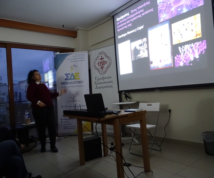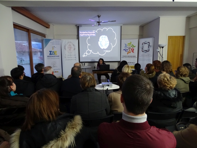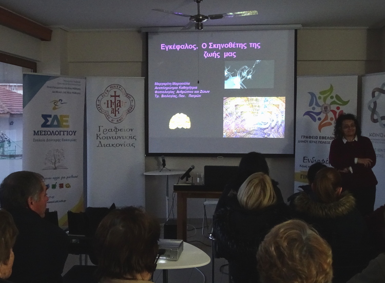 Με μεγάλη επιτυχία το νεοσύστατο Σχολείο Δεύτερης Ευκαιρίας Μεσολογγίου πραγματοποίησε στις 13 Φεβρουαρίου, την πρώτη του ανοιχτή εκδήλωση για την ευρύτερη τοπική κοινωνία με ομιλήτρια την αναπληρώτρια καθηγήτρια του τμήματος Βιολογίας του Πανεπιστημίου Πατρών, κα Μαριγούλα Μαργαρίτη με θέμα: «Εγκέφαλος... ο σκηνοθέτης της ζωής μας», στον φιλόξενο Πολυχώρο του Γραφείου Κοινωνικής Διακονίας της Ιεράς Μητροπόλεως Αιτωλίας και Ακαρνανίας.