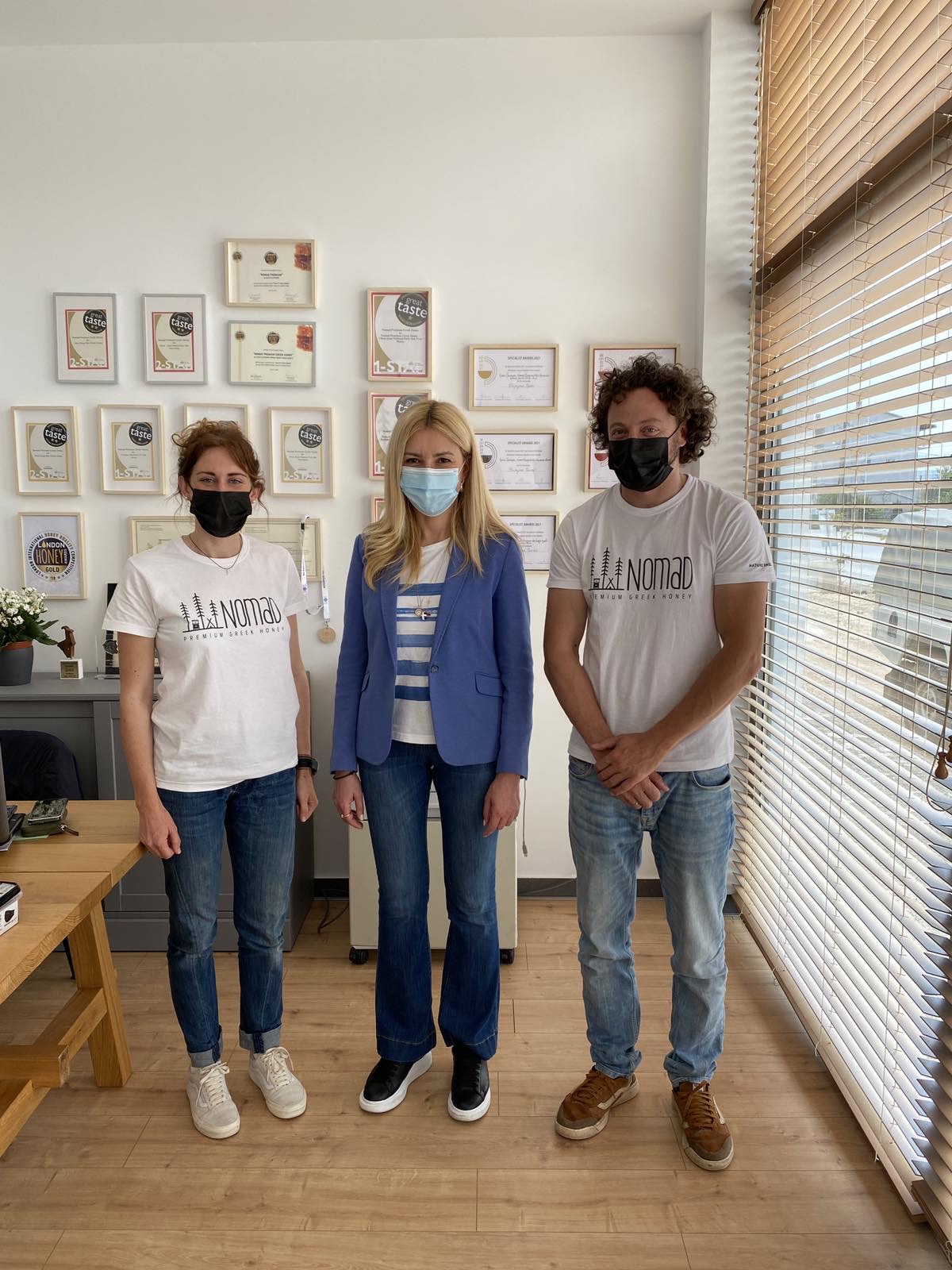 Στη συνέχεια, η Υφυπουργός επισκέφθηκε την επιχείρηση «Nomad Honey», μια καθετοποιημένη μεταποιητική μονάδα παραγωγής μελιού, που συνδυάζει την παραδοσιακή νομαδική μελισσοκομία με τη δημιουργικότητα, την καινοτομία και την υψηλή ποιότητα. Ξεναγήθηκε στο σύγχρονο εργαστήριο, που συσκευάζει αγνό, ακατέργαστο μέλι συγκεκριμένης γεωγραφικής ένδειξης σε διαφορετικές γεύσεις και συνθέσεις και παράγει ένα καινοτόμο προϊόν, το πρώτο ελληνικό ενεργειακό «τζελάκι», όπως ονομάζεται στον χώρο του αθλητισμού, από 100% φυσικό μέλι, γύρη και αλάτι.