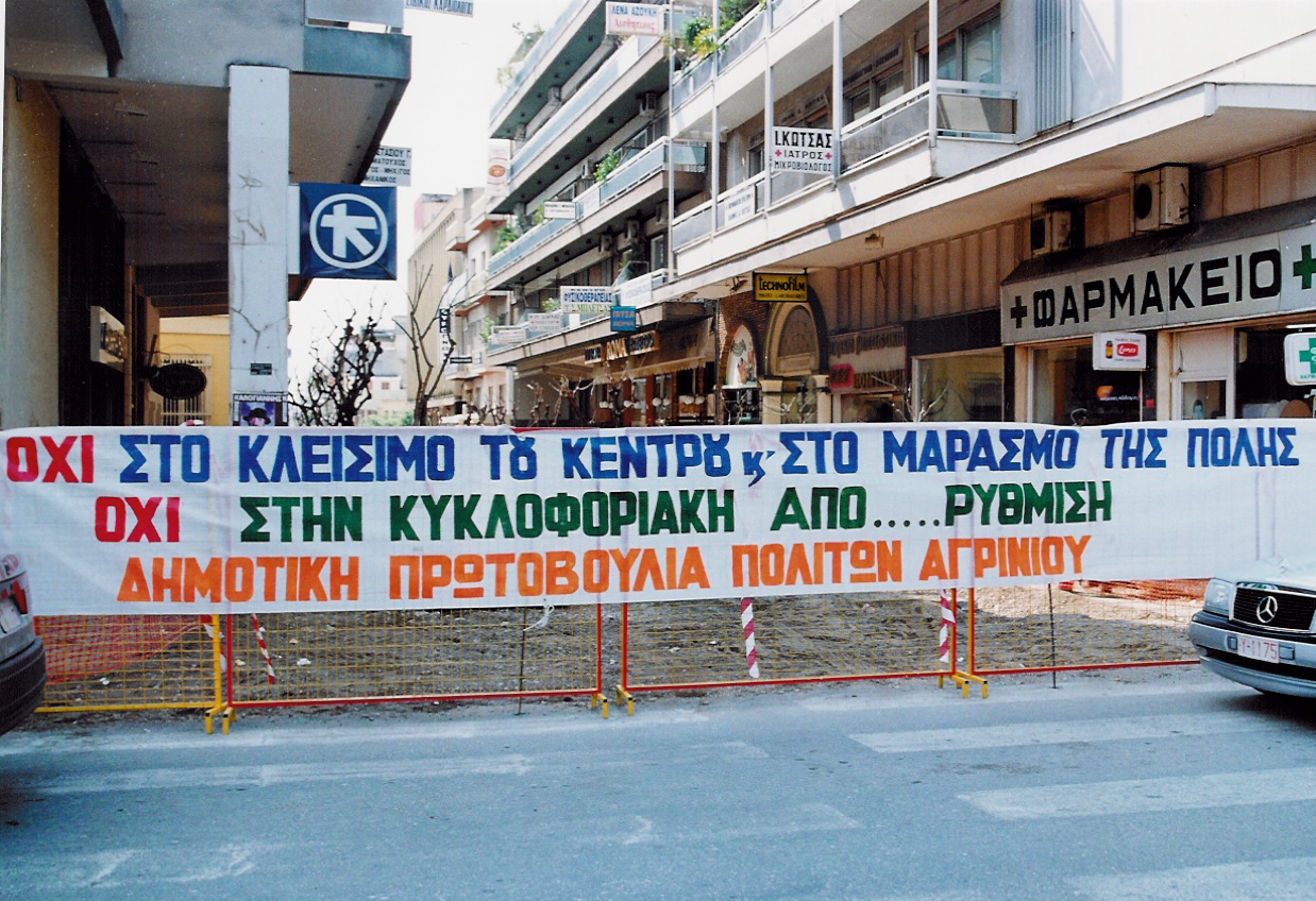Η διαχείριση του δημόσιου χώρου και της κυκλοφορίας των οχημάτων ανάμεσα σε ανθρώπους είναι ένα από τα μεγάλα ζητούμενα στον σύγχρονο κόσμο του καταναλωτικού παροξυσμού. Αντί για χώροι ανάπτυξης και πολλαπλασιασμού της κοινωνικότητας, αυτοί συρρικνώνονται, εξαφανίζονται ή δεν προβλέπονται καν στα νέα σχέδια οικιστικής ανάπτυξης της πόλης, όπως στο Αγρίνιο. Οι πλατείες και οι δρόμοι μετατρέπονται σε μεγάλα «ενυδρεία», σε ουδέτερους και άνευρους χώρους, χωρίς πράσινο, χωρίς το υγρό στοιχείο. Αυτοί οι χώροι τώρα κλείνουν οριστικά. Εκεί που πρέπει να σφυρηλατείται, ιδιαίτερα στις μέρες μας, ο νέος κοινωνισμός και η αλληλεγγύη των δημοτών, τώρα γίνονται αφιλόξενοι χώροι.