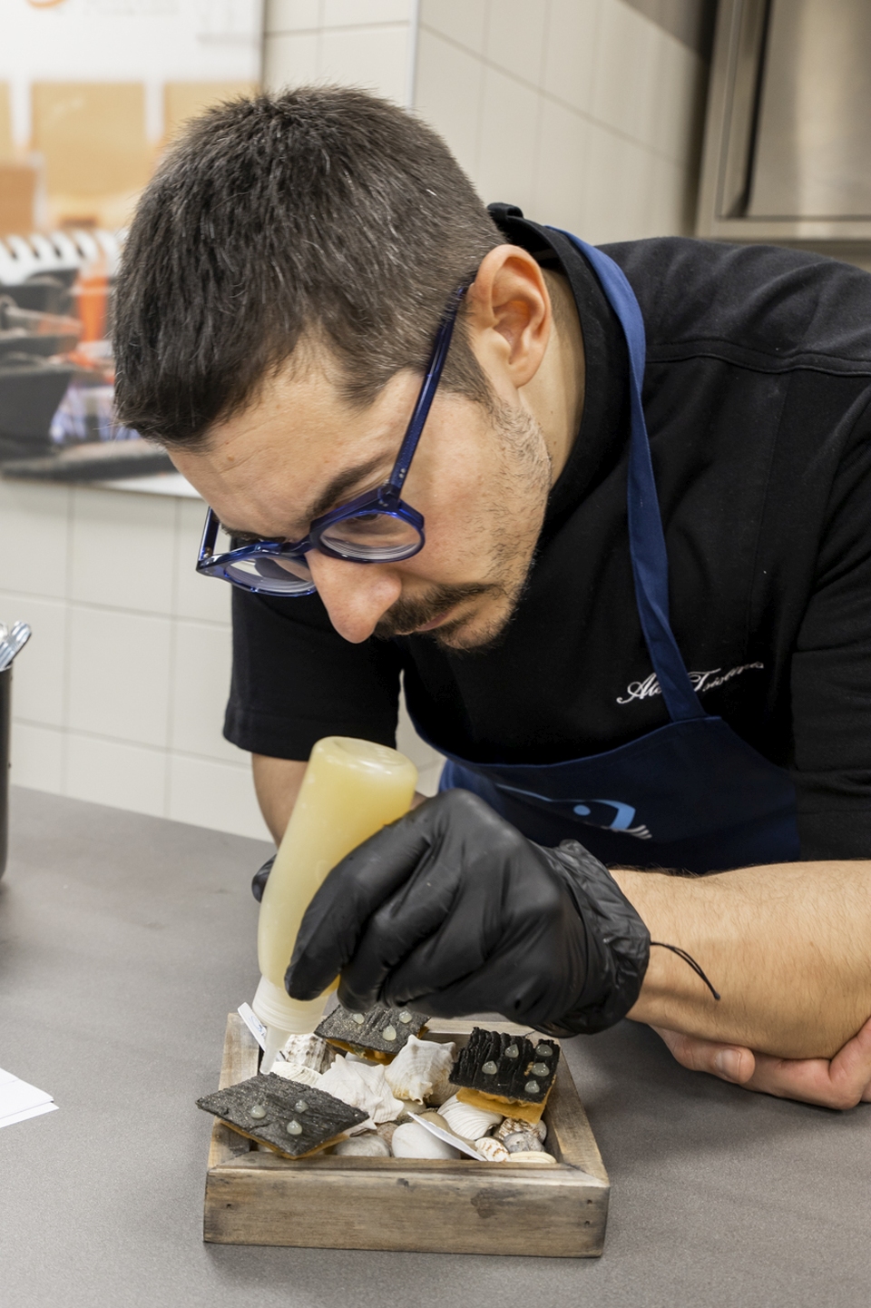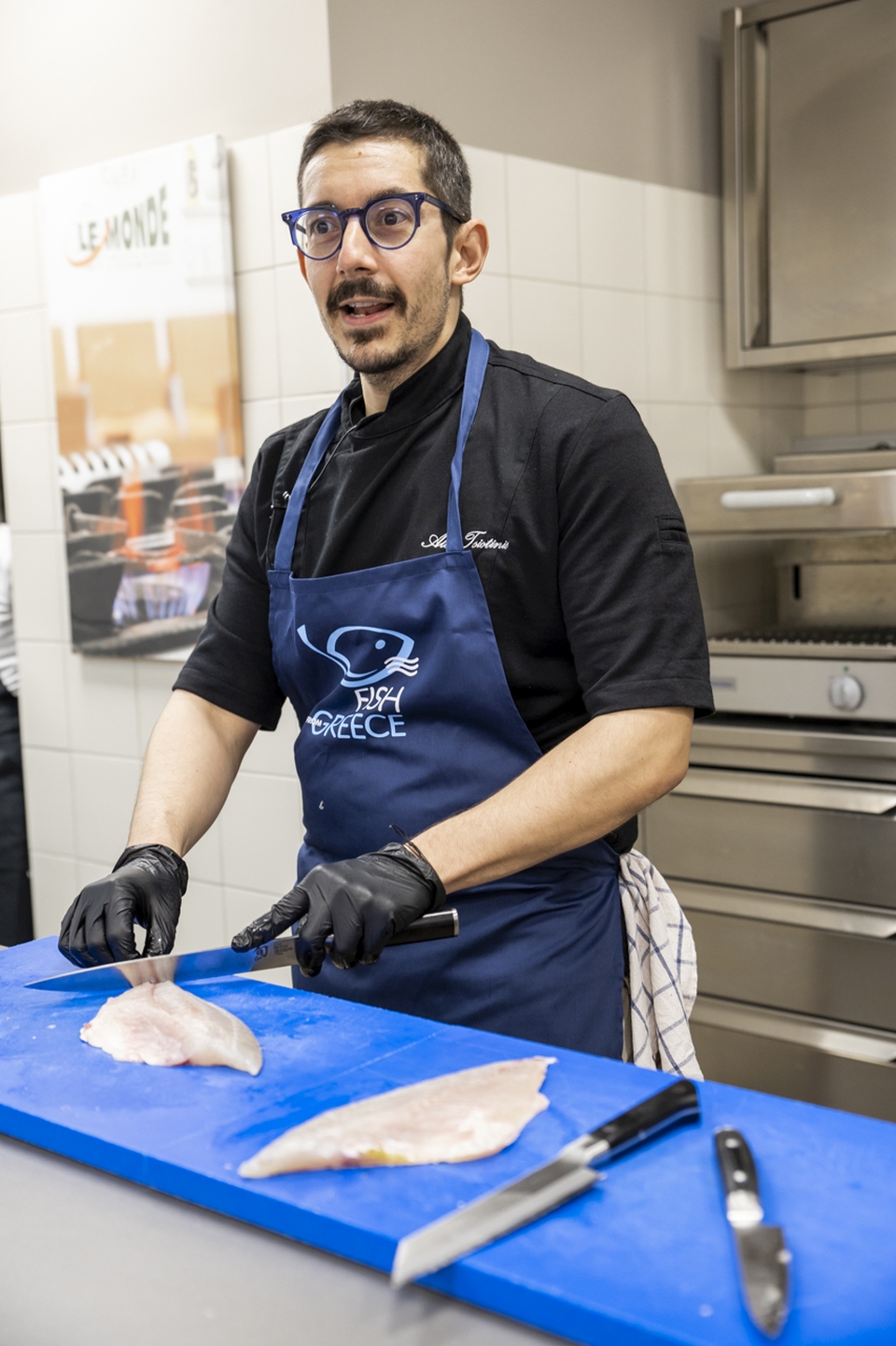 Στο 1ο σεμινάριο με θέμα «Η δημιουργική κουζίνα του Αλέξανδρου Τσιοτίνη με φρέσκα ψάρια Ιχθυοκαλλιέργειας Fish From Greece» ο σεφ τόνισε ότι η επιτυχία μιας γαστρονομικής σύνθεσης είναι ένας συνδυασμός σωστής τεχνικής και άριστης πρώτης ύλης και έδωσε έμπνευση στους σπουδαστές παρουσιάζοντας τρεις πρωτότυπες συνταγές: Λαβράκι φρικασέ με baby μαρούλι και αυγολέμονο από ξινόγαλα, Ταρτάρ από φαγκρί βραχύπτερο σαν αθηναϊκή σαλάτα με δάκρυα μαστίχας, και The Classic Unclassic Burger από κρανιό.