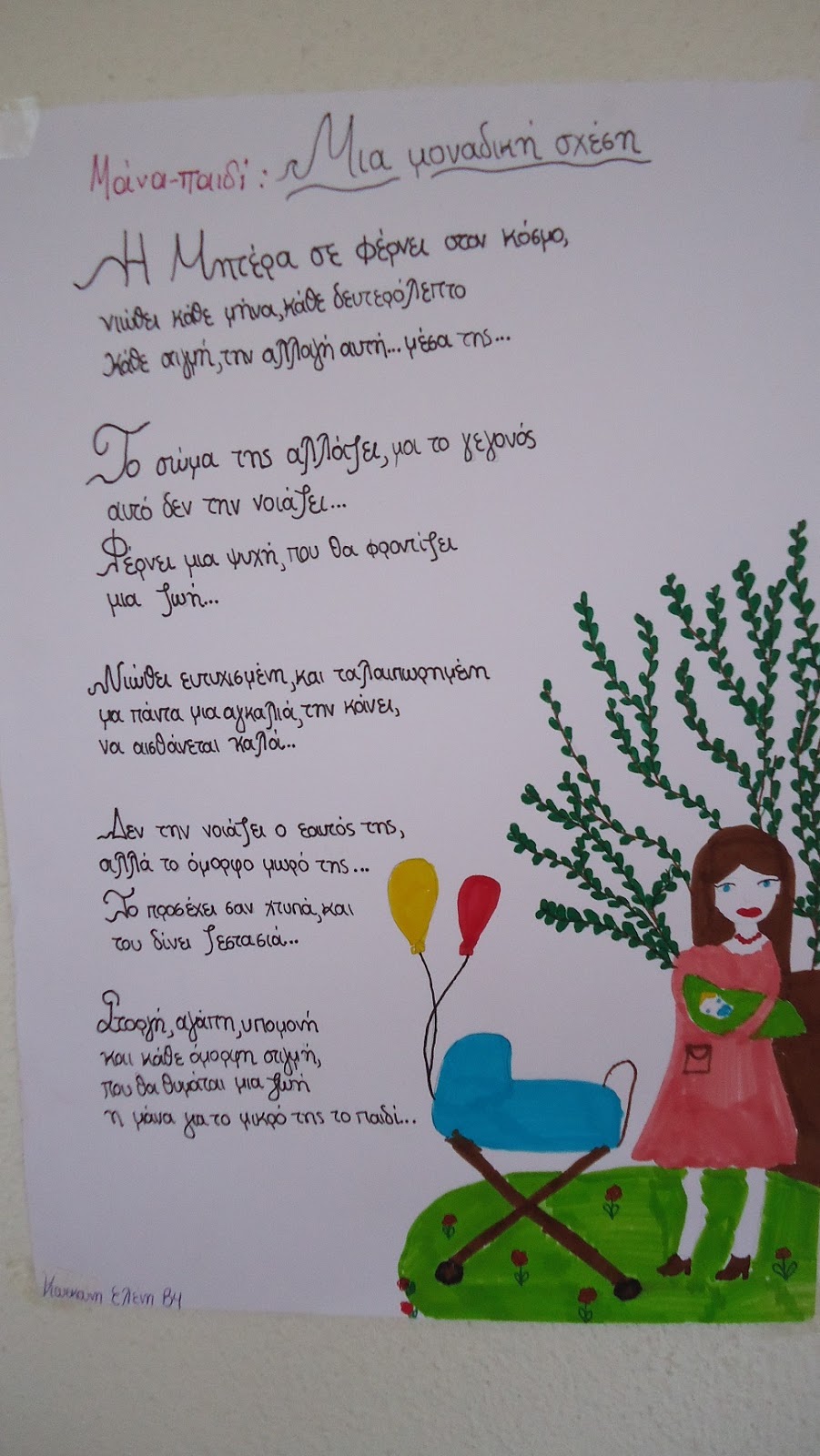 Όταν ολοκληρώθηκε το μάθημα και οι τυπικές εργασίες, προέτρεψα τα παιδιά, αν ήθελαν, να γράψουν ένα δικό τους έργο  για τη μάνα. (πεζό ή ποίημα).Πολλές φορές προτρέπω και ενθαρρύνω τους μαθητές να γράφουν… Αρκετοί ανταποκρίθηκαν με προθυμία και έδωσαν καλά δείγματα δημιουργικής γραφής. Αφιερωμένα στη σημερινή μάνα: