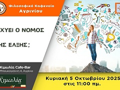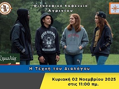 Το Φιλοσοφικό Καφενείο Αγρινίου μας προσκαλεί στην επόμενη συνάντηση που θα πραγματοποιηθεί την Κυριακή, 02/11/2025, στις 11:00 π.μ., στο Κιμωλία Cafe-Bar (Mπουκογιάννη 4, Αγρίνιο). Θα συζητήσουμε για το διάλογο ως τρόπου εποικοδομητικής επικοινωνίας στις ανθρώπινες σχέσεις, αλλά και ως τέχνης του φιλοσοφείν στη ζωή μας. Σας περιμένουμε – Είσοδος ελεύθερη! Εισηγητές: Έλενα Τριανταφυλλίδη και…