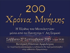 Η «ΔΙΕΞΟΔΟΣ» ΤΙΜΑ ΤΑ 200 ΧΡΟΝΙΑ ΑΠΟ ΤΗΝ ΕΞΟΔΟ Με στόχο την ακτινοβολία που θα πρέπει να εκπέμψει το Μεσολόγγι τον επόμενο χρόνο που θα γιορτάσει τα 200 χρόνια από την εθελοθυσία των Ελεύθερων Πολιορκημένων, η «Διέξοδος», στο μέτρο των δικών της δυνάμεων και με αίσθημα ευθύνης, όπως επί 27 συνεχή χρόνια πράττει, σχεδίασε μια σειρά εκδηλώσεων που θα πραγματοποιηθούν σε όλη τη διάρκεια του χρόνου…